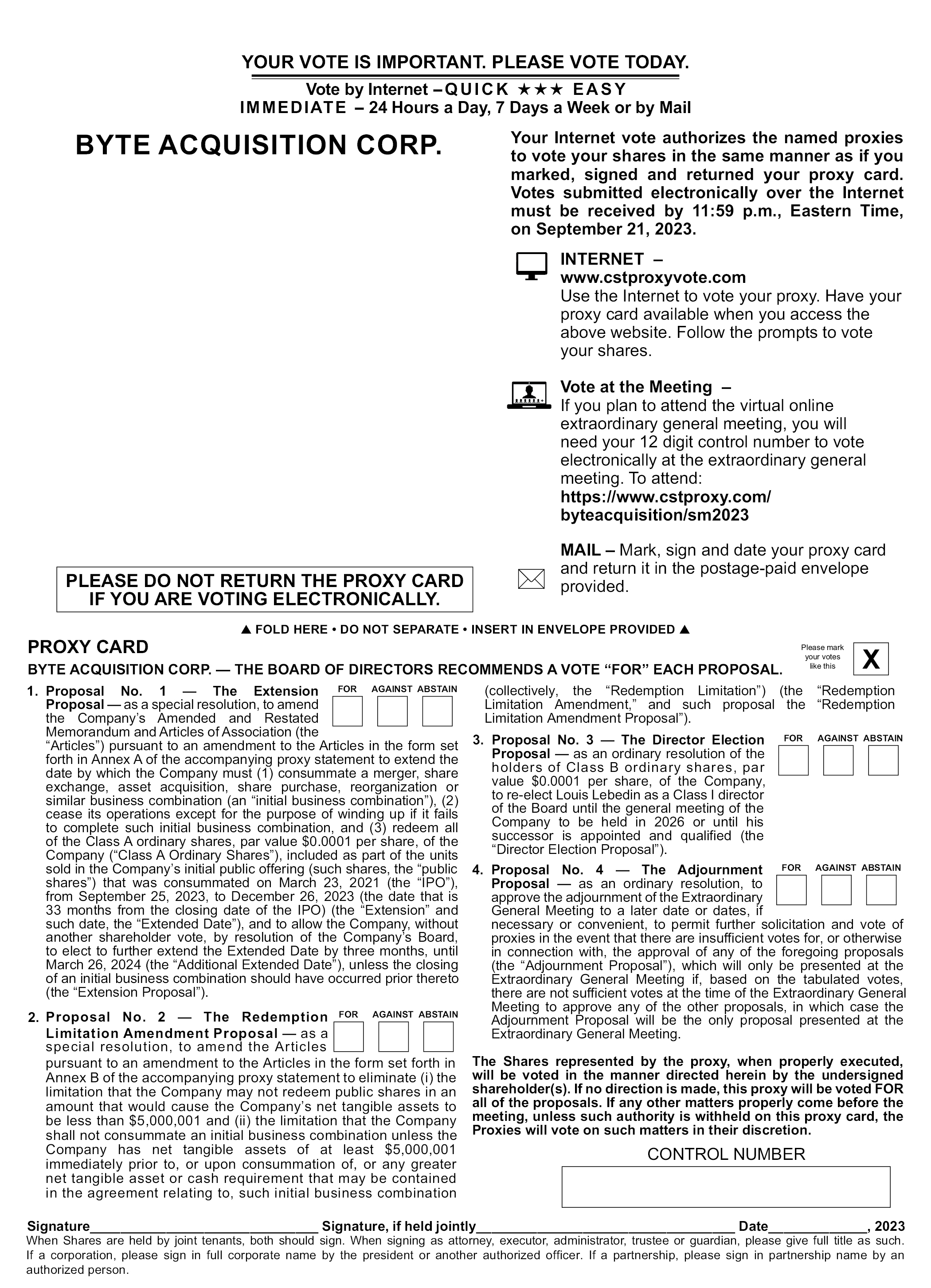 YOUR VOTE IS IMPORTANT. PLEASE VOTE TODAY. IMMEDIATE - 24 Hours a Day, 7 Days a Week or by Mail Vote by Internet - QUICK EASY BYTE ACQUISITION CORP. Your Internet vote authorizes the named proxies to vote your shares in the same manner as if you marked, signed and returned your proxy card. Votes submitted electronically over the Internet must be received by 11:59 p.m., Eastern Time, on September 21, 2023. INTERNET – www.cstproxyvote.com Use the Internet to vote your proxy. Have your proxy card available when you access the above website. Follow the prompts to vote your shares. Vote at the Meeting – If you plan to attend the virtual online extraordinary general meeting, you will need your 12 digit control number to vote electronically at the extraordinary general meeting. To attend: https://www.cstproxy.com/ byteacquisition/sm2023 MAIL – Mark, sign and date your proxy card and return it in the postage-paid envelope provided. PLEASE DO NOT RETURN THE PROXY CARD IF YOU ARE VOTING ELECTRONICALLY.FOLD HERE DO NOT SEPARATE INSERT IN ENVELOPE PROVIDED PROXY CARD BYTE ACQUISITION CORP. — THE BOARD OF DIRECTORS RECOMMENDS A VOTE “FOR” EACH PROPOSAL. Please mark your votes like this 1. Proposal No. 1 — The Extension Proposal — as a special resolution, to amend the Company’s Amended and Restated Memorandum and Articles of Association (the “Articles”) pursuant to an amendment to the Articles in the form set forth in Annex A of the accompanying proxy statement to extend the date by which the Company must (1) consummate a merger, share exchange, asset acquisition, share purchase, reorganization or similar business combination (an “initial business combination”), (2) cease its operations except for the purpose of winding up if it fails to complete such initial business combination, and (3) redeem all of Class A ordinary shares, par value $0.0001 per share, of the Company (“Class A Ordinary Shares”), included as part of the units sold in the Company’s initial public offering (such shares, the “public shares”) that was consummated on March 23, 2021 (the “IPO”), from September 25, 2023, to December 26, 2023 (the date that is 33 months from the closing date of the IPO) (the “Extension” and such date, the “Extended Date”), and to allow the Company, without another shareholder vote, by resolution of the Company’s Board, to elect to further extend the Extended Date by three months, until March 26, 2024 (the “Additional Extended Date”), unless the closing of an initial business combination should have occurred prior thereto (the “Extension Proposal”). FOR AGAINST ABSTAIN 2. — Proposal No. 2 — The Redemption Limitation Amendment Proposal — as a special resolution, to amend the Articles pursuant to an amendment to the Articles in the form set forth in Annex B of the accompanying proxy statement to eliminate (i) the limitation that the Company may not redeem public shares in an amount that would cause the Company’s net tangible assets to be less than $5,000,001 and (ii) the limitation that the Company shall not consummate an initial business combination unless the Company has net tangible assets of at least $5,000,001 immediately prior to, or upon consummation of, or any greater net tangible asset or cash requirement that may be contained in the agreement relating to, such initial business combination (collectively, the “Redemption Limitation”) (the “Redemption Limitation Amendment,” and such proposal the “Redemption Limitation Amendment Proposal”). 3. Proposal No. 3 — The Director Election Proposal — as an ordinary resolution of the holders of the Class B ordinary shares, par value $0.0001 per share, of the Company, to re-elect Louis Lebedin as a Class I director of the Board until the general meeting of the Company to be held in 2026 or until his successor is appointed and qualified (the “Director Election Proposal”). 4. Proposal No. 4 — The Adjournment Proposal — as an ordinary resolution, to approve the adjournment of the Extraordinary General Meeting to a later date or dates, if necessary or convenient, to permit further solicitation and vote of proxies in the event that there are insufficient votes for, or otherwise in connection with, the approval of any of the foregoing proposals (the “Adjournment Proposal”), which will only be presented at the Extraordinary General Meeting if, based on the tabulated votes, there are not sufficient votes at the time of the Extraordinary General Meeting to approve any of the other proposals, in which case the Adjournment Proposal will be the only proposal presented at the Extraordinary General Meeting. The Shares represented by the proxy, when properly executed, will be voted in the manner directed herein by the undersigned shareholder(s). If no direction is made, this proxy will be voted FOR all of the proposals. If any other matters properly come before the meeting, unless such authority is withheld on this proxy card, the Proxies will vote on such matters in their discretion. CONTROL NUMBER Signature Signature, if held jointly Date, 2023 When Shares are held by joint tenants, both should sign. When signing as attorney, executor, administrator, trustee or guardian, please give full title as such. If a corporation, please sign in full corporate name by the president or another authorized officer. If a partnership, please sign in partnership name by an authorized person.