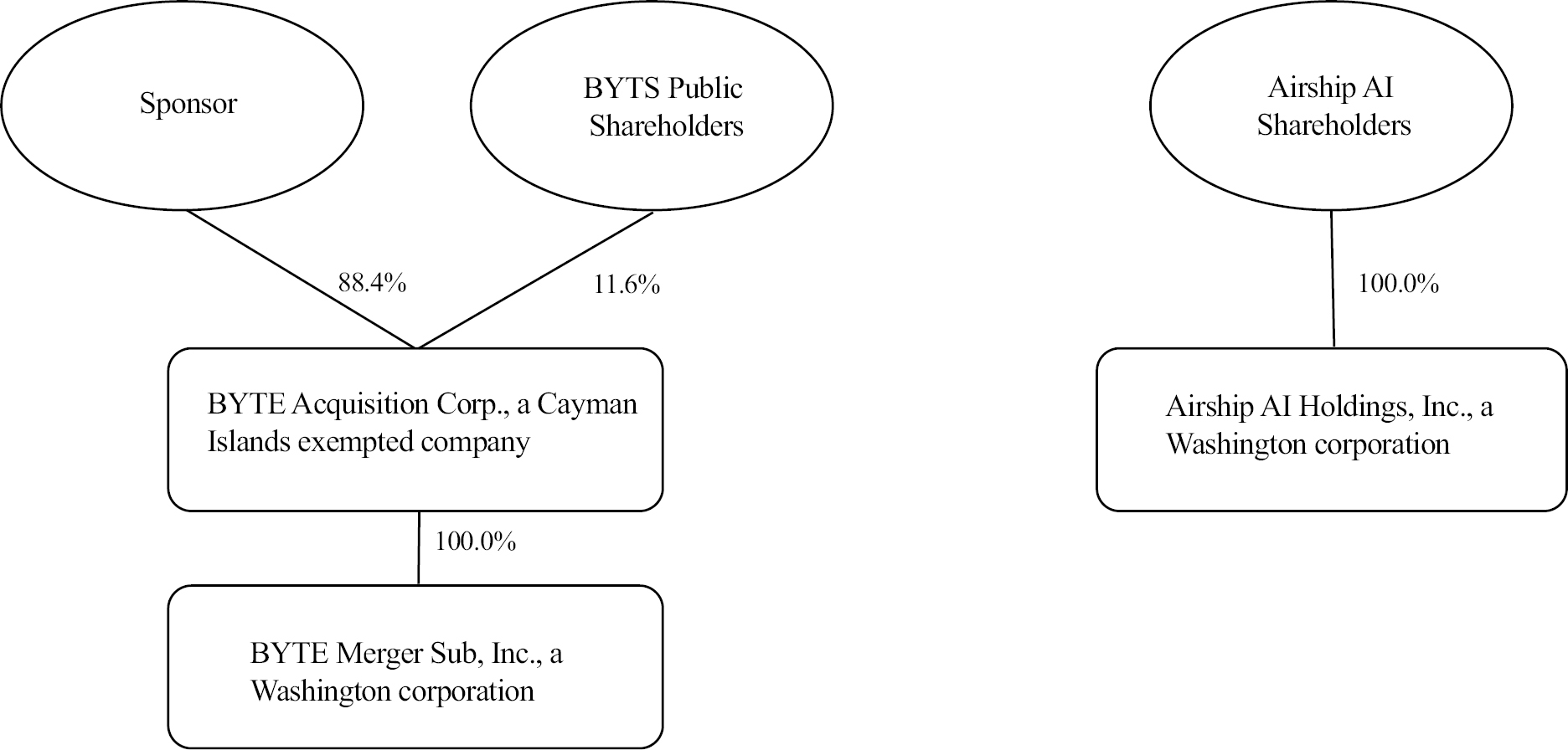 On June 26, 2023, the board of directors of BYTE Acquisition Corp., a Cayman Islands exempted company (“BYTS”), unanimously approved the Merger Agreement, dated as of June 27, 2023, by and among BYTS, BYTE Merger Sub, Inc., a Washington corporation and a direct, wholly-owned subsidiary of BYTS (“Merger Sub”) and Airship AI Holdings, Inc., a Washington company (“Airship AI”), attached to this proxy statement/prospectus as Annex A (as amended on September 22, 2023 and as may be further amended and/or restated from time to time, the “Merger Agreement”). If the Merger Agreement is approved by BYTS’s shareholders and the transactions contemplated by the Merger Agreement are consummated, the following will occur: (1) the domestication of BYTS as a Delaware corporation in accordance with the Delaware General Corporation Law (“DGCL”), the Cayman Islands Companies Act (As Revised) (the “Companies Act”) and the amended and restated memorandum and articles of association of BYTS (as may be amended from time to time, the “Cayman Constitutional Documents”), in which BYTS will de-register from the Register of Companies in the Cayman Islands by way of continuation out of the Cayman Islands and into the State of Delaware so as to migrate to and domesticate as a Delaware corporation in accordance with the Cayman Constitutional Documents, Section 388 of the DGCL and Part XII of the Companies Act (the “Domestication”); (2) the merger (the “Merger”) of Merger Sub with and into Airship AI, pursuant to which, at the closing of the transactions contemplated by the Merger Agreement (the “Closing”), the separate corporate existence of Merger Sub will cease and Airship AI will be the surviving corporation and a wholly-owned subsidiary of BYTS, pursuant to the terms of the Merger Agreement and in accordance with the Washington Business Corporation Act, as amended, as more fully described elsewhere in this proxy statement/prospectus; and (3) the other transactions contemplated by the Merger Agreement and documents related thereto (such transactions, together with the Domestication and the Merger, the “Proposed Transaction” or “Business Combination”). In connection with the Proposed Transaction, BYTS will be renamed “Airship AI Holdings, Inc.” (“Airship Pubco”).