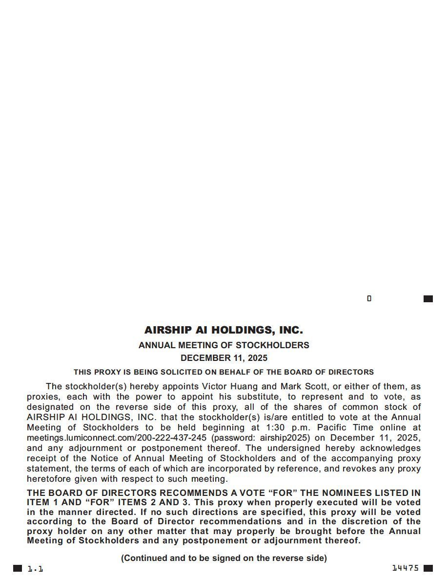 You may attend the Annual Meeting online only if you are an Airship AI’s stockholder who is entitled to vote at the Annual Meeting, or if you hold a valid proxy for the Annual Meeting. The Annual Meeting will be a completely virtual meeting and is scheduled to be held on December 11, 2025 at 1:30 p.m., Pacific time, via live webcast through the following link: meetings.lumiconnect.com/200-222-437-245. You will need the 16-digit control number provided in the Notice of Internet Availability of Proxy Materials, on your proxy card (if applicable) or on the instructions that accompanied your proxy materials. You may virtually attend the Annual Meeting, vote, and submit a question during the Annual Meeting by visiting meetings.lumiconnect.com/200-222-437-245 and using your 16-digit control number. If you are not a stockholder of record but hold shares as a beneficial owner in “street name,” you should contact your bank or broker to obtain your 16-digit control number or otherwise vote through the bank or broker. If you lose your 16-digit control number, you may join the Annual Meeting as a “Guest” but you will not be able to vote, ask questions or access the list of stockholders as of the Record Date. The meeting webcast will begin promptly at 1:30 p.m., Pacific time. Online check-in will begin at 1:15 p.m., Pacific time, and you should allow ample time for check-in procedures.