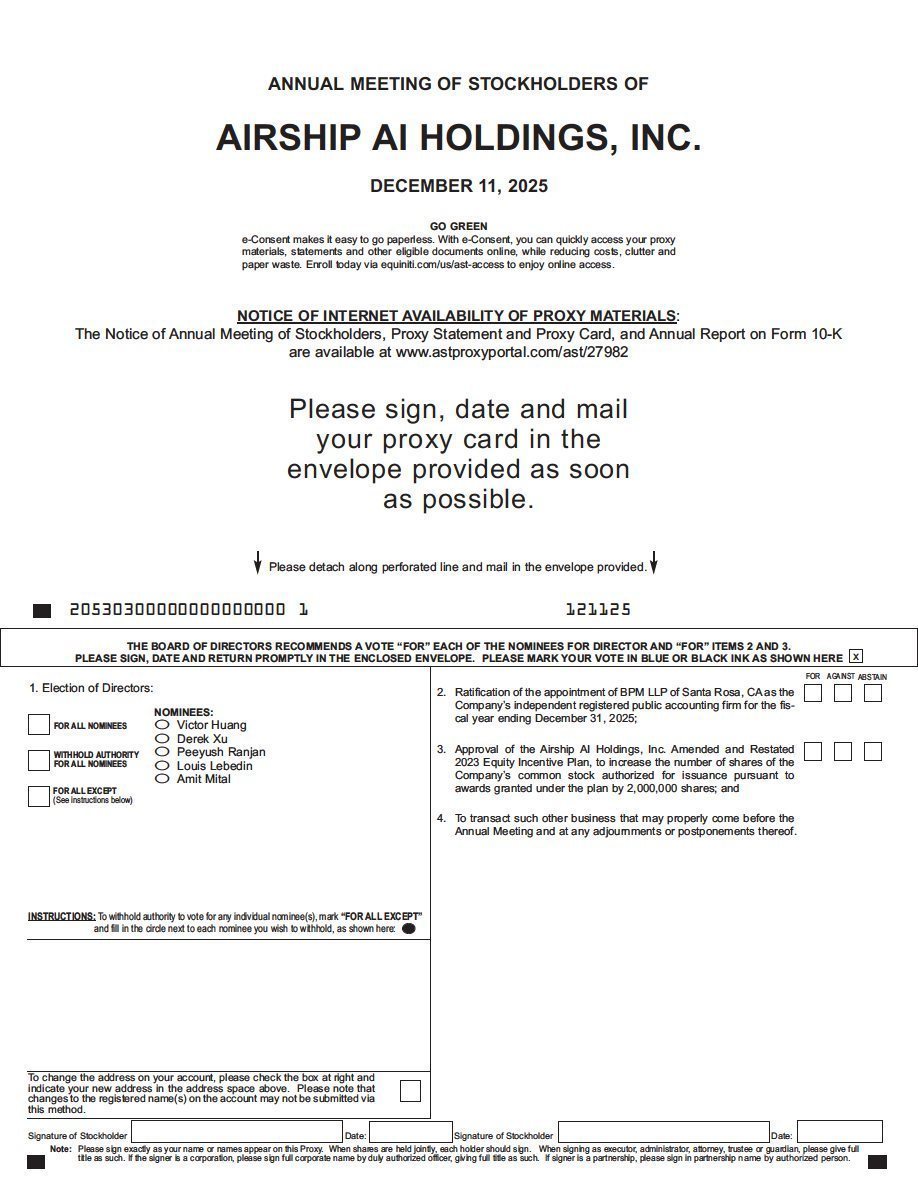 You are cordially invited to attend the 2025 Annual Meeting of Stockholders of Airship AI Holdings, Inc. (the “Company”) and any adjournments or postponements thereof (the “Annual Meeting”). The Annual Meeting will be held on Thursday, December 11, 2025, at 1:30 p.m., Pacific time. This year’s Annual Meeting will be a completely virtual meeting and will be conducted via live webcast on the Internet, providing a consistent experience to all stockholders regardless of location.
