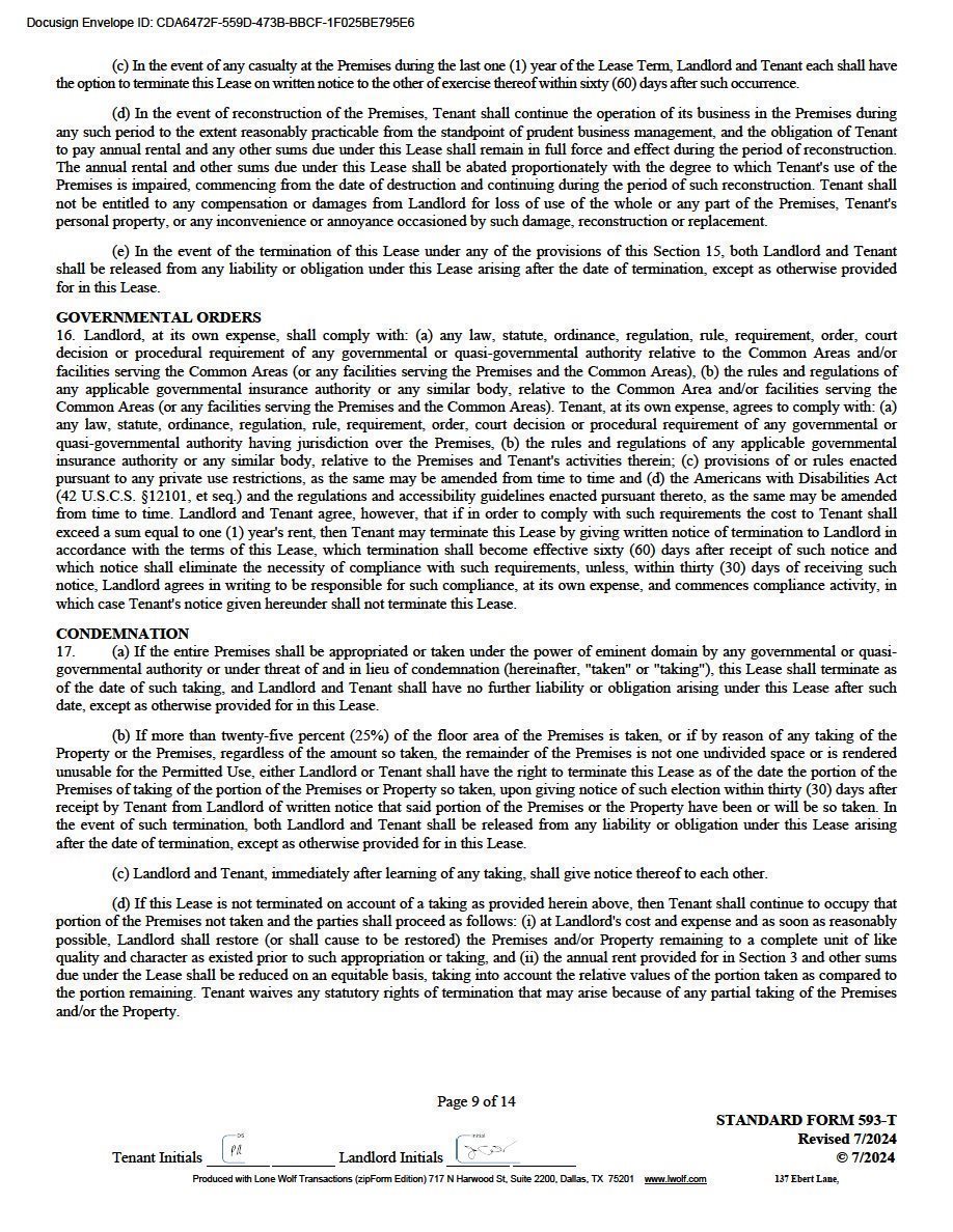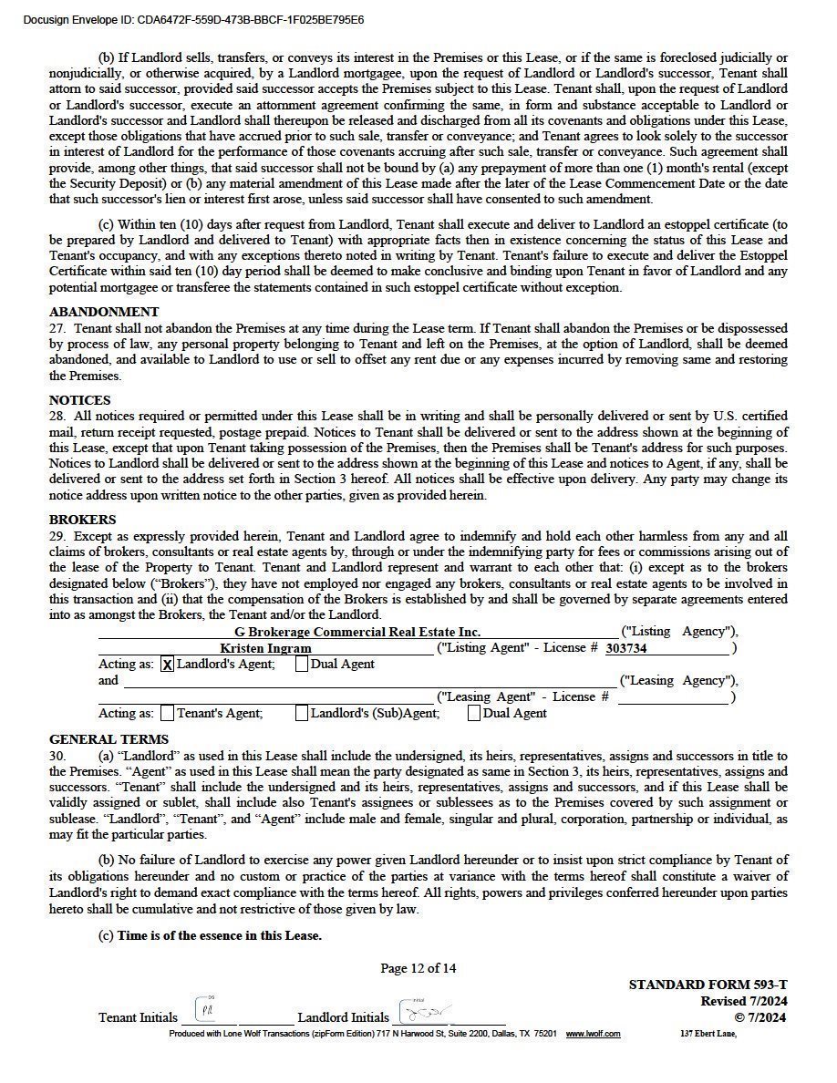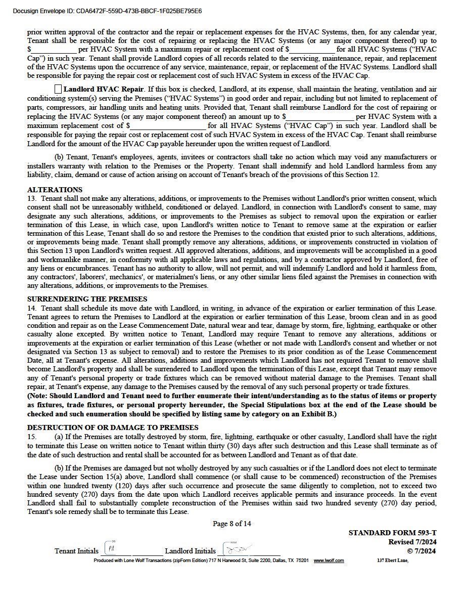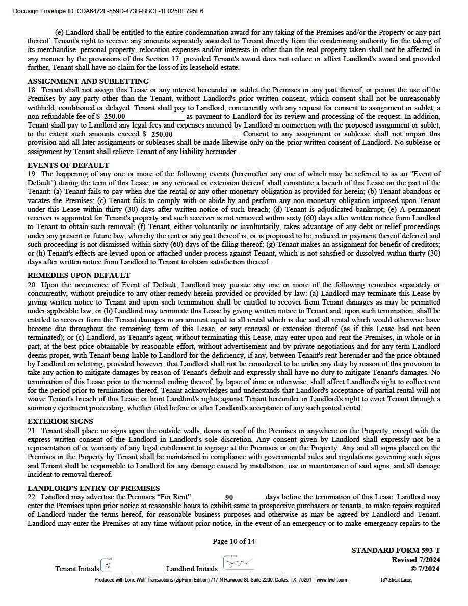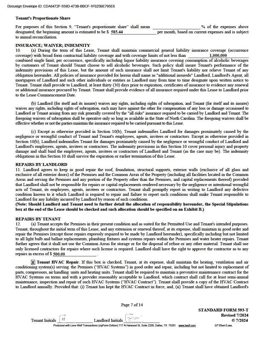 | Due at Lease Signing: | Security Deposit, 1st month Gross Rent, Certificate of Insurance $15,000 Non-Refundable Contribution towards Upfit |