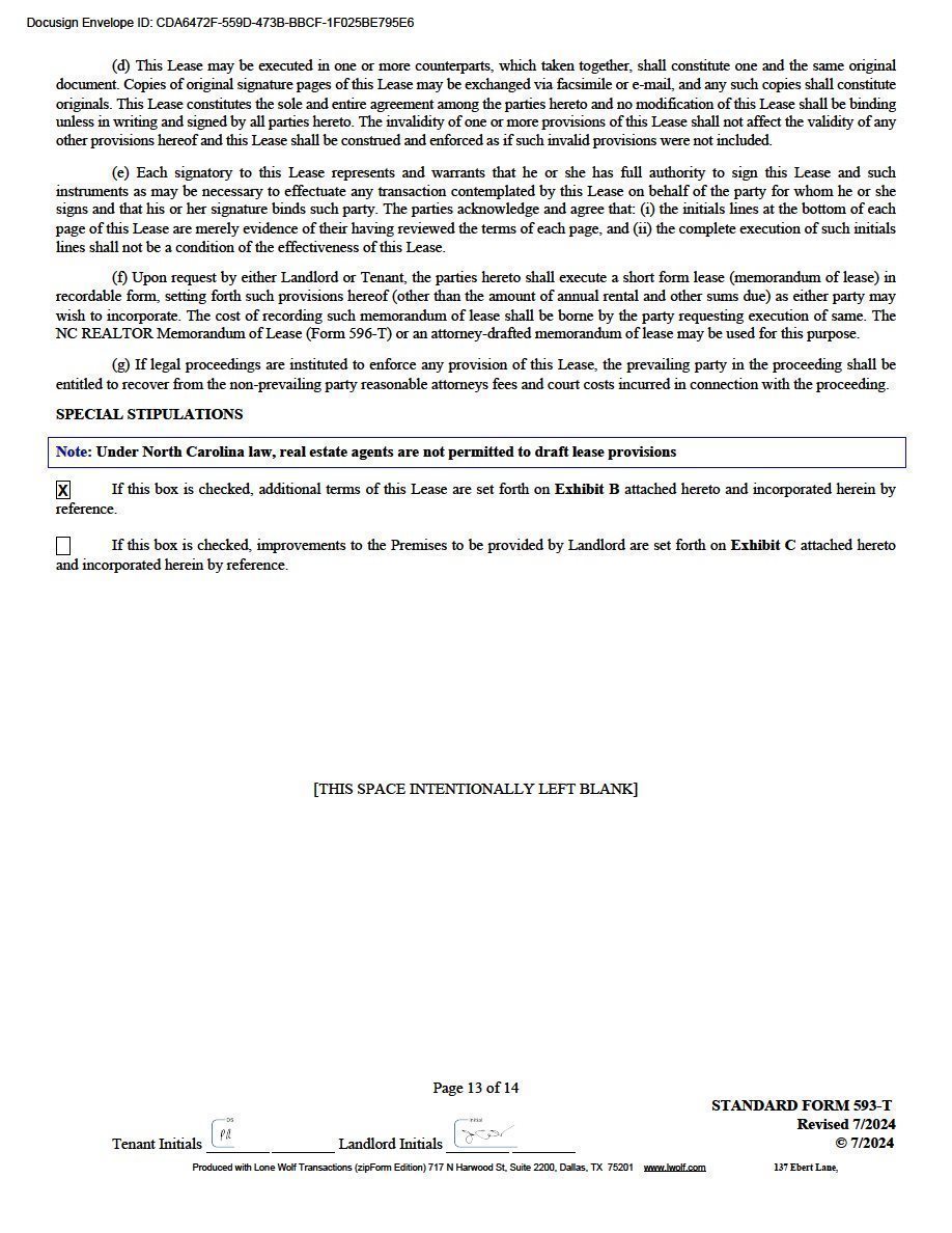 | Landlord’s Work: | See Attached Below for Build Out ($15,000 Non-Refundable Contribution towards upfit due at Lease Execution) |