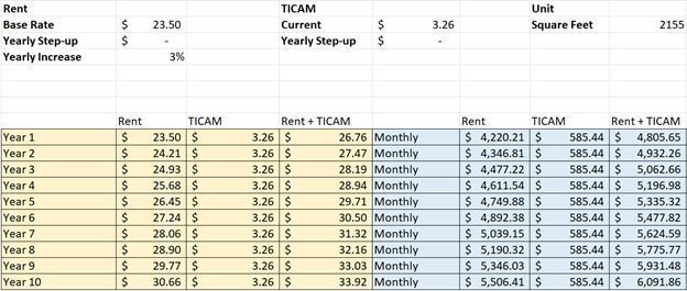 | Additional Rent | TICAMS: $3.26 PSF X 2,155 sq.ft.= $585.44 per month |