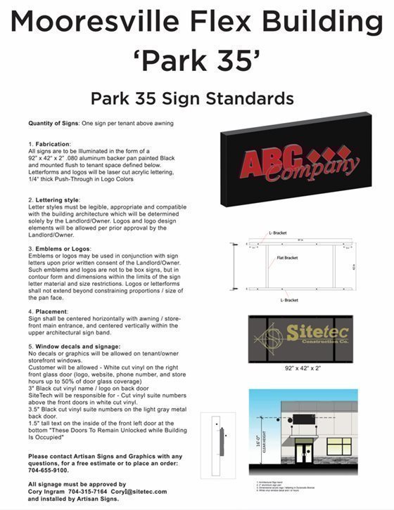 Signage: Must conform to the attached sign standards per Park 35 and completed/installed by Artisan Signs. (See attached below).